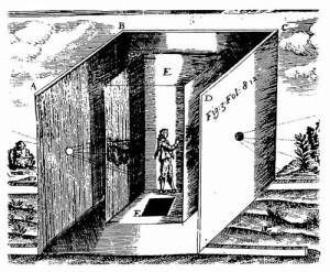 There are descriptions of entire dark rooms with a lens called a Camera Obscura… which simply means “Dark Room” With little more technology than a piece of glass, one could use the natural sunlight to project an image onto a canvas. (albeit upside down)