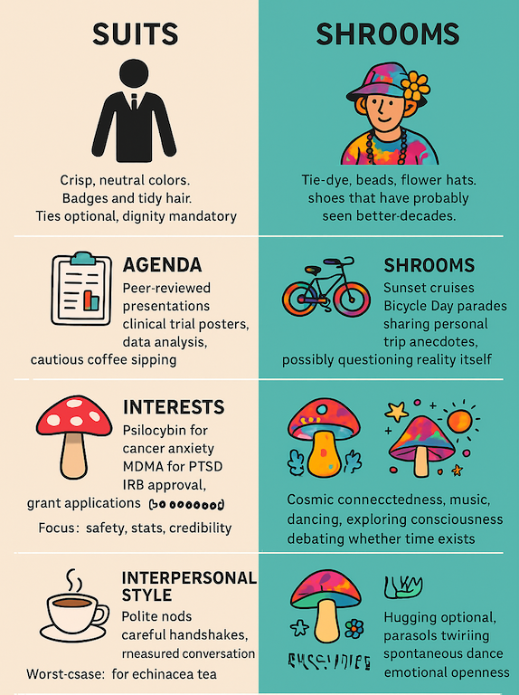 Half the attendees wear suits, badges, and carefully curated skepticism. The other half wear tie-dye, beads, and shoes that smell faintly of patchouli. One side presents peer-reviewed results on psilocybin for cancer anxiety, the other side can describe in minute detail the color of their last hallucination.